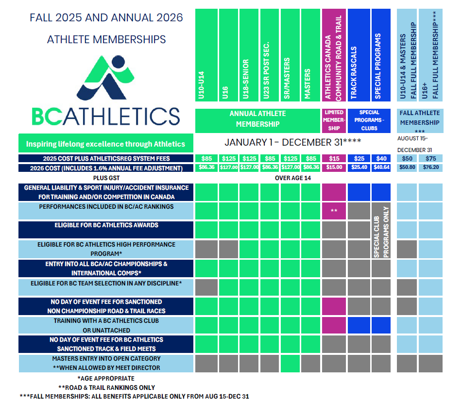 - Valid for entry in all BC Athletics sanctioned events excluding provincial and national championships